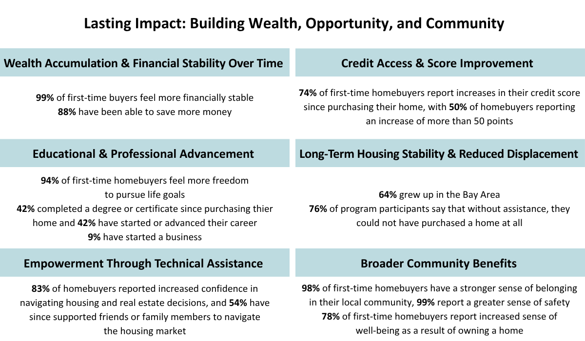 The evaluation also highlights broader community impacts. Many participants reported greater ability to pursue education and career advancement, support family members, and remain rooted in the Bay Area—outcomes that are increasingly important as affordability pressures continue to challenge families across the region.